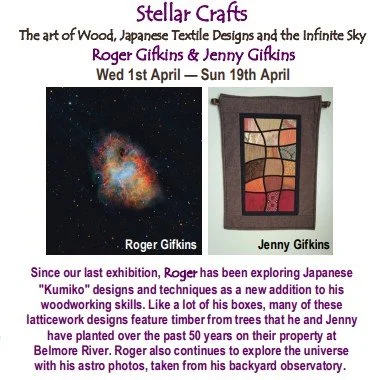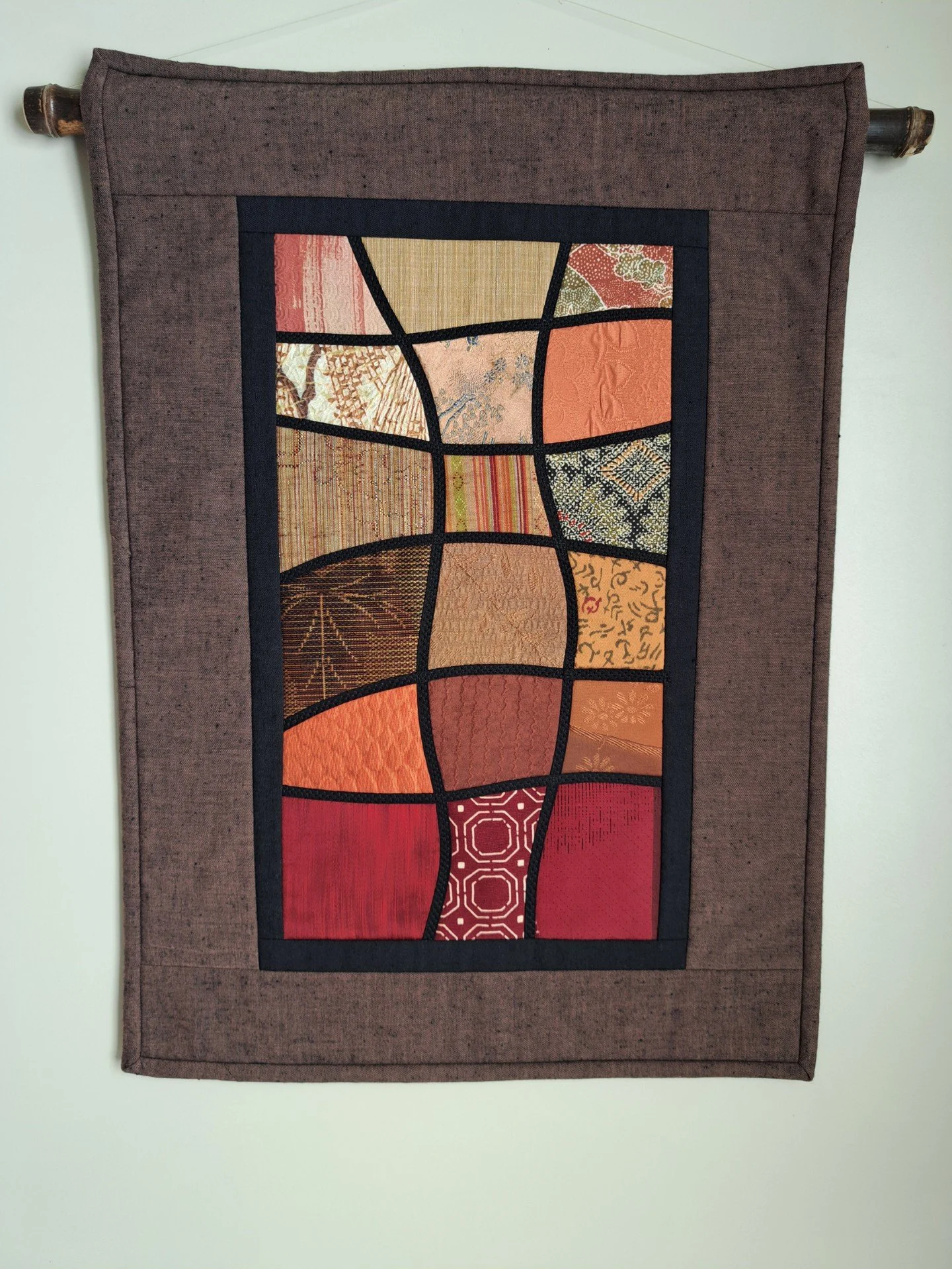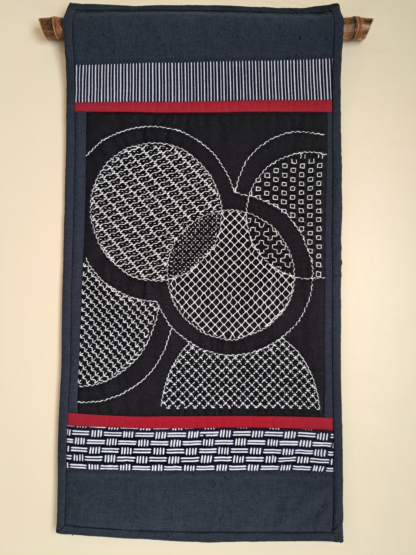 Jenny's work reflects a lifelong love of textiles, nowadays nearly always gravitating towards Japanese fabrics, style and techniques. Her work encompasses iconic Japanese motifs such as ginko leaves, cranes, bamboo, cherry blossoms, fans and Torii gates. She uses Japanese techniques such as "Sashiko" and "Boro"stitching, "Kogin" embroidery and "Shibori" dyeing, along with Applique, Meshwork and Quilting. Jenny has lately enjoyed including recycled fabrics from Kimonos and Obis from Japan in her pieces.